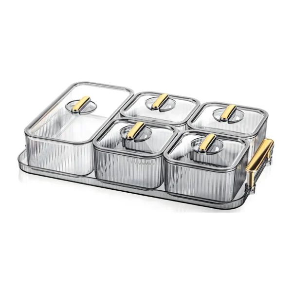 Design: Ensemble de 5 contenants transparents avec couvercles, présentés sur un plateau