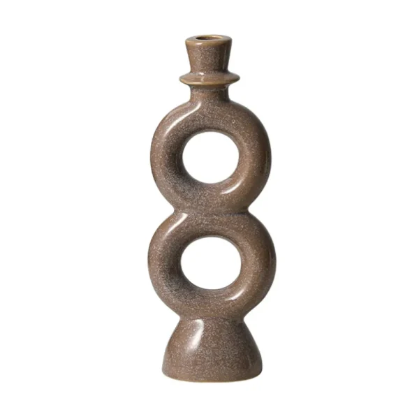 Bougeoir en céramique marron au style moderne, composé de deux cercles ajourés formant une silhouette élégante. Parfait pour créer une ambiance chaleureuse et raffinée sur une table ou une étagère.