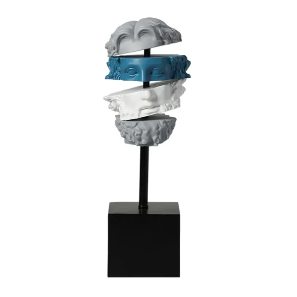 Cette sculpture en résine au design fragmenté revisite les codes de l’art classique avec une touche moderne et audacieuse. Ses couleurs contrastées et sa structure éclatée créent un effet visuel saisissant, symbolisant la dualité entre tradition et contemporanéité. Posée sur un socle noir élégant, elle devient une pièce maîtresse au fort pouvoir décoratif.