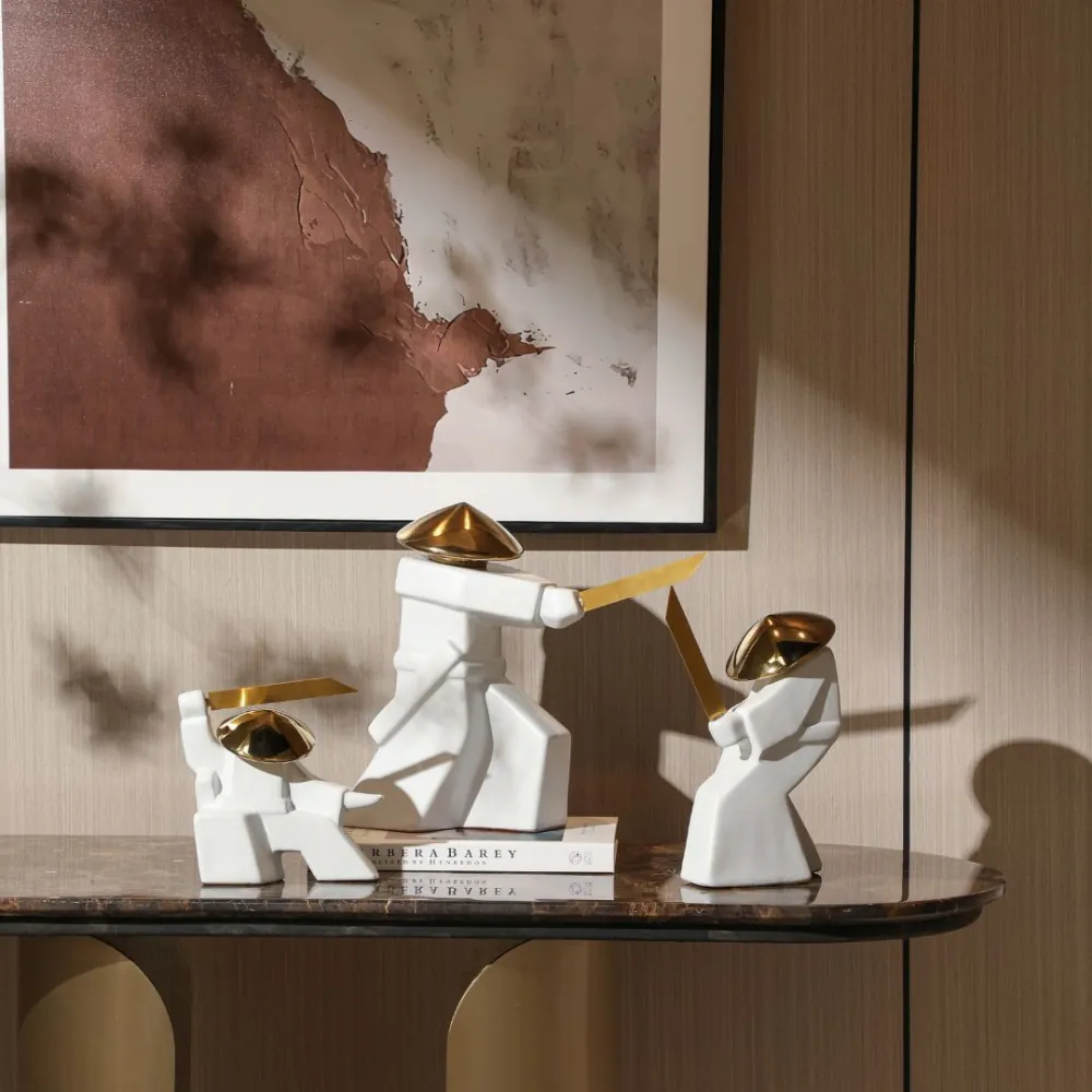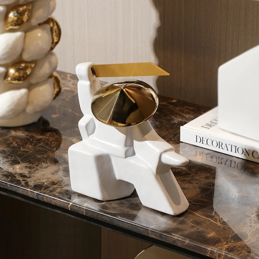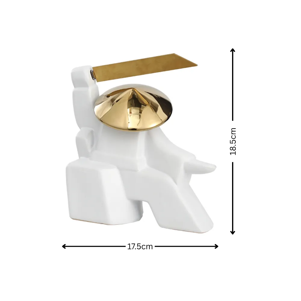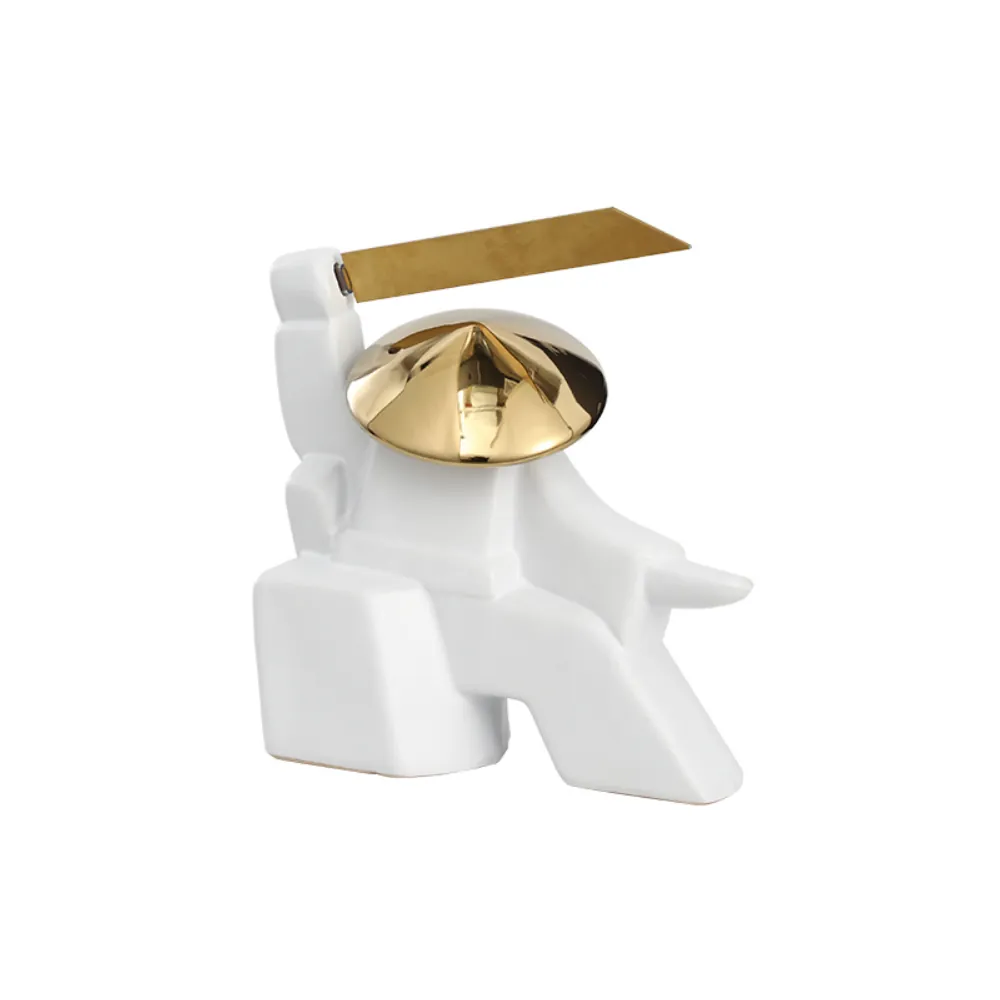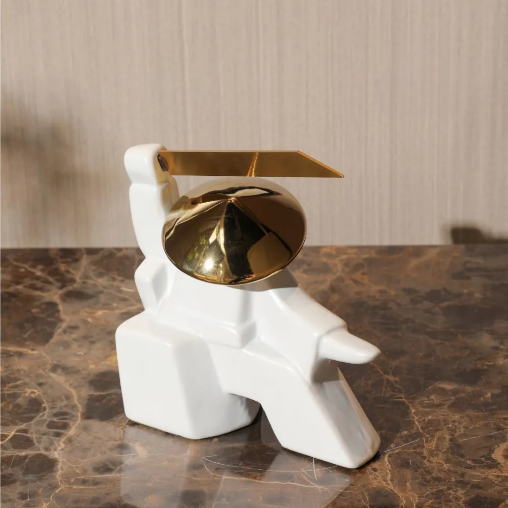 Pièce décorative moderne en céramique blanche avec détails dorés métallisés. Son style géométrique et futuriste attire le regard et ajoute une touche d’audace et de sophistication à votre intérieur.