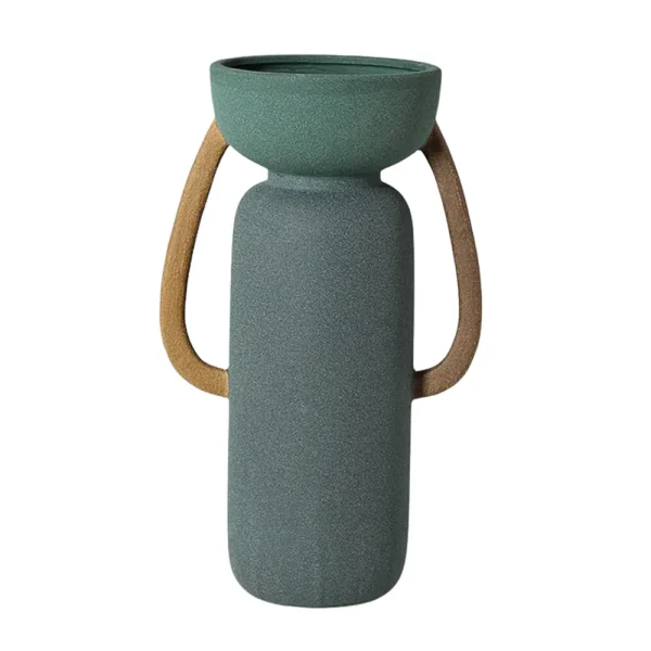 Vase en céramique vert mat avec poignées couleur terre, inspiré du design artisanal. Son allure simple et élégante s’intègre parfaitement dans une déco moderne, bohème ou naturelle.