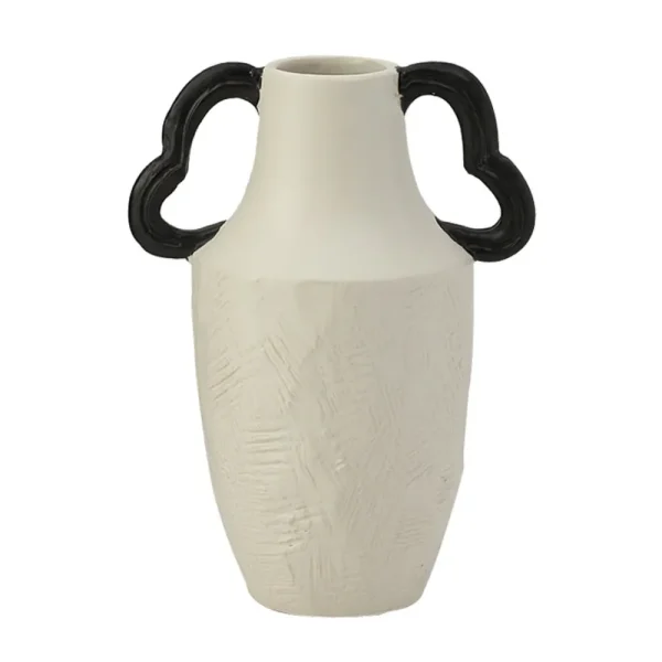 Vase en céramique blanche avec deux poignées noires originales. Son design artisanal et contrasté apporte une touche moderne et artistique à tout type d’intérieur.