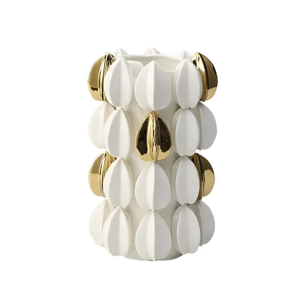 Vase en céramique orné de reliefs organiques blancs et dorés, offrant un effet luxueux et raffiné. Idéal pour sublimer une table, une console ou une étagère avec une touche d’élégance artistique.