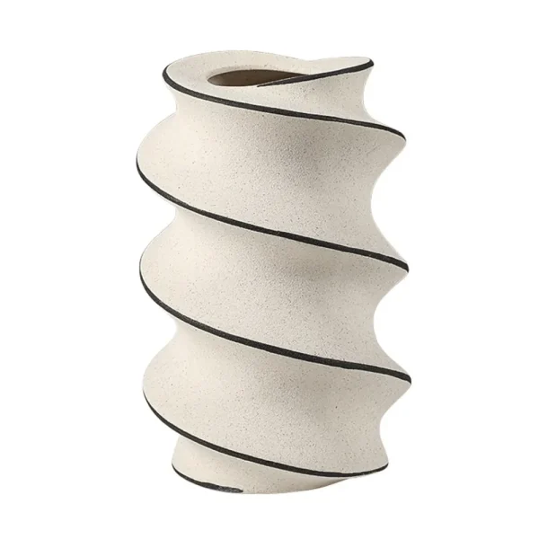 Vase en céramique beige orné d’une spirale noire élégante. Son design ondulé apporte mouvement et modernité à votre décoration, idéal pour sublimer des branches sèches ou des fleurs colorées.