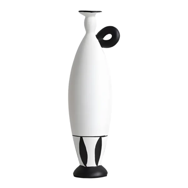 Vase décoratif en céramique au design artistique et minimaliste, mêlant courbes élégantes et détails géométriques noirs. Sa silhouette élancée, rehaussée d’une anse circulaire, évoque une œuvre sculpturale moderne. Idéal pour sublimer une décoration contemporaine, il attire le regard aussi bien seul qu’en composition sur une console ou une table basse.