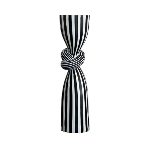 Vase décoratif en céramique au design original et artistique, orné de rayures verticales noires et blanches. Son nœud central lui confère une allure sculpturale et dynamique, transformant un simple accessoire en véritable œuvre d’art. Idéal pour une décoration moderne et audacieuse, il se distingue sur une console, une table ou une étagère design.