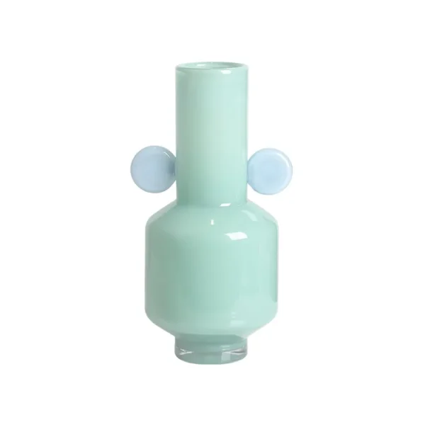 Ce vase en verre au design audacieux attire le regard par sa silhouette élancée et ses deux disques roses délicatement intégrés sur les côtés. À la fois minimaliste et artistique, il marie modernité et fantaisie avec subtilité. Idéal pour apporter une touche colorée et contemporaine à une table, une étagère ou un coin de salon.