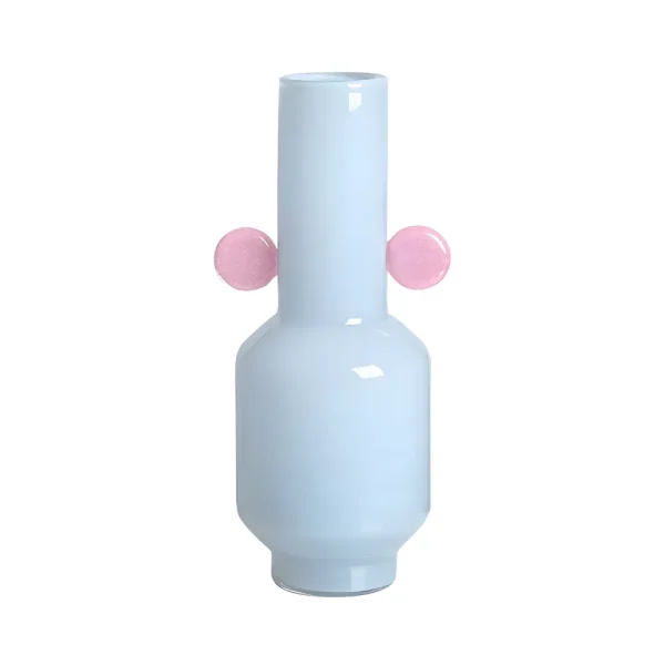 Ce vase en verre au design audacieux attire le regard par sa silhouette élancée et ses deux disques roses délicatement intégrés sur les côtés. À la fois minimaliste et artistique, il marie modernité et fantaisie avec subtilité. Idéal pour apporter une touche colorée et contemporaine à une table, une étagère ou un coin de salon.