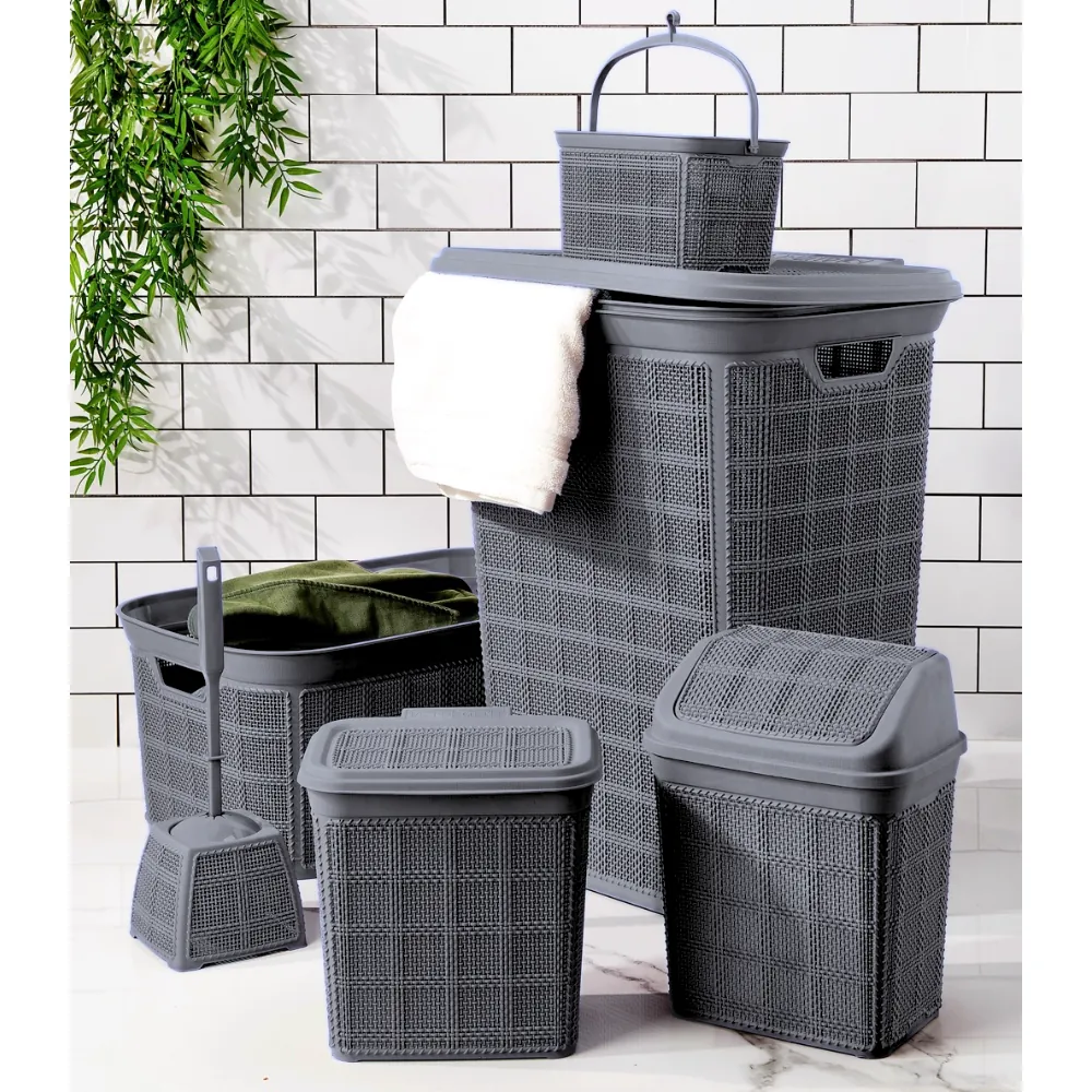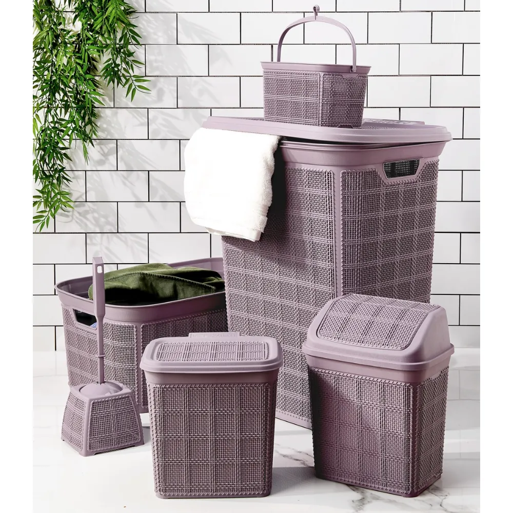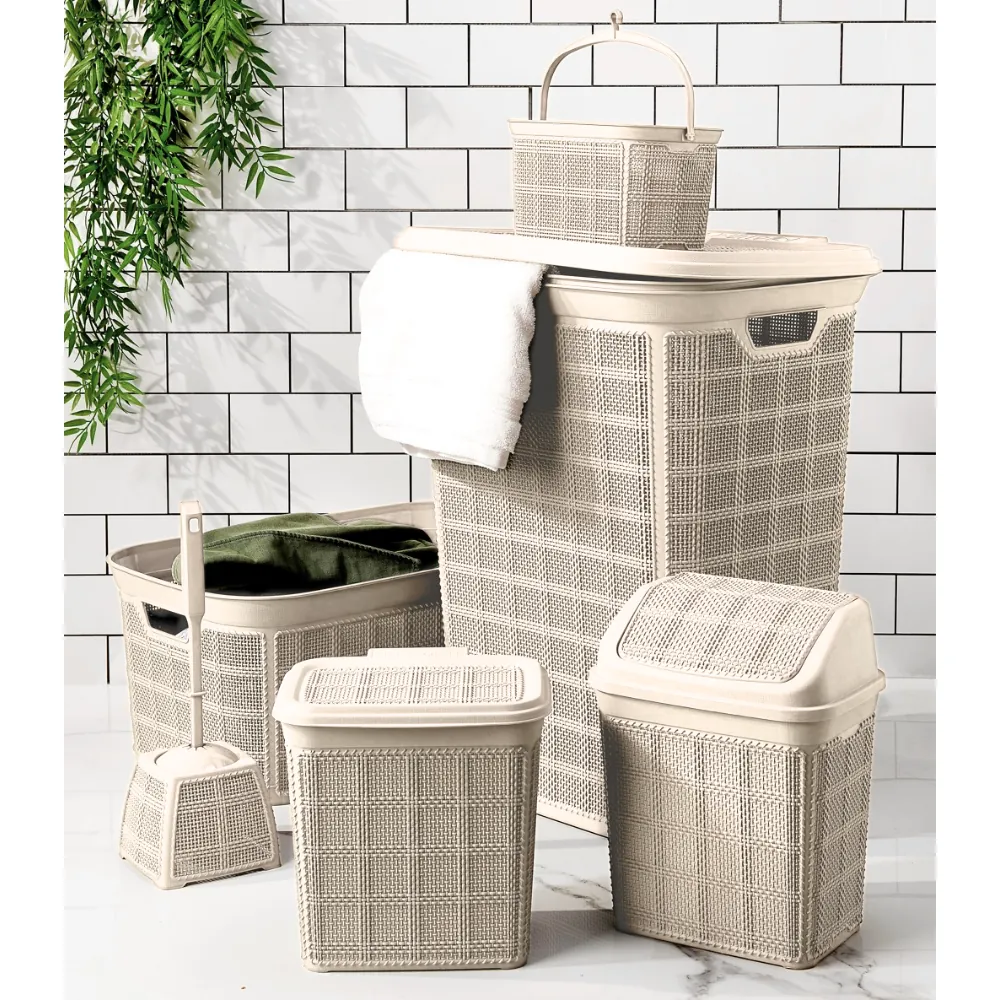 Composition : panier à linge sale, panier à linge propre, poubelle, brosse WC, boite de détergent, boite de pinces à linge